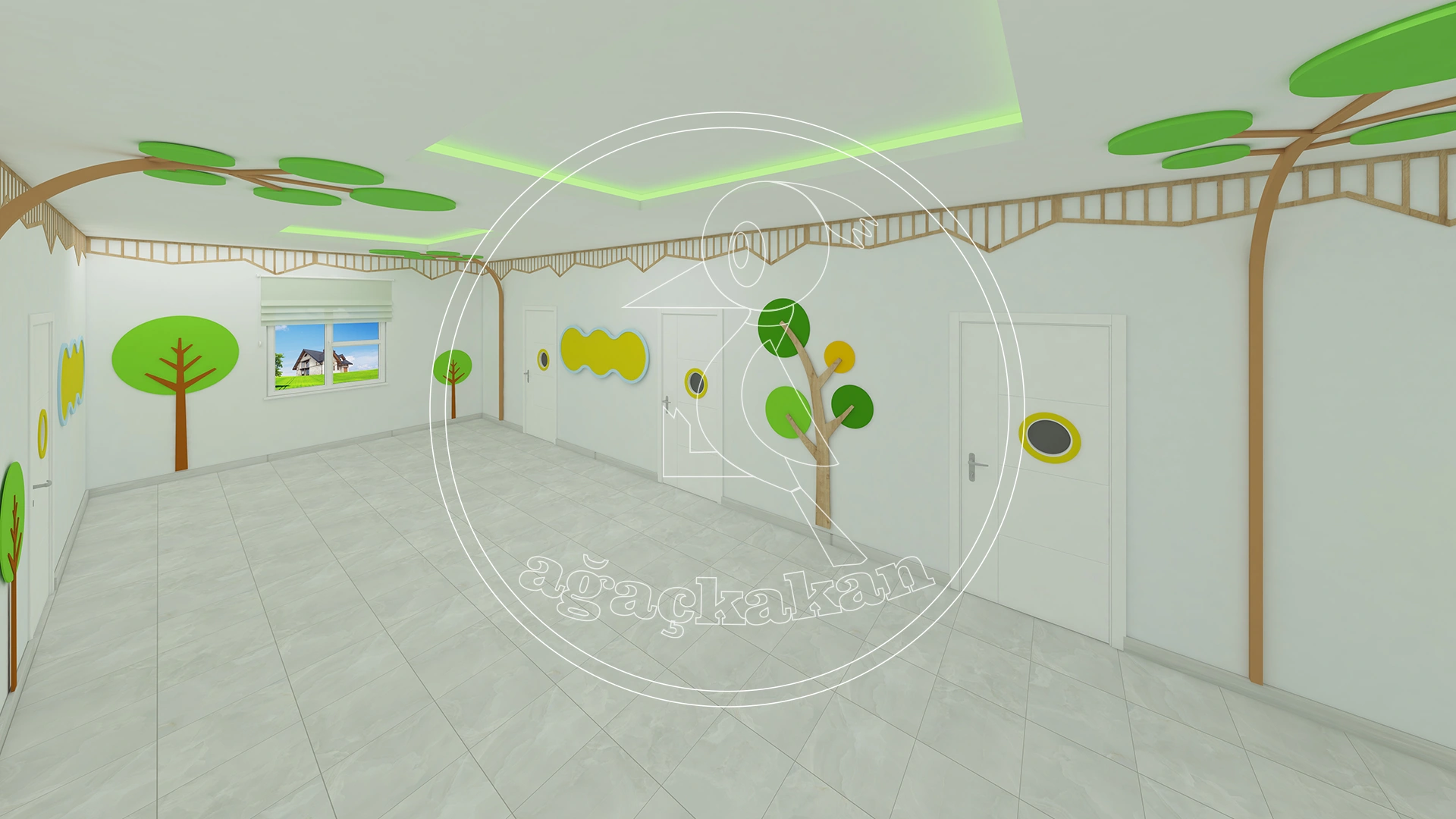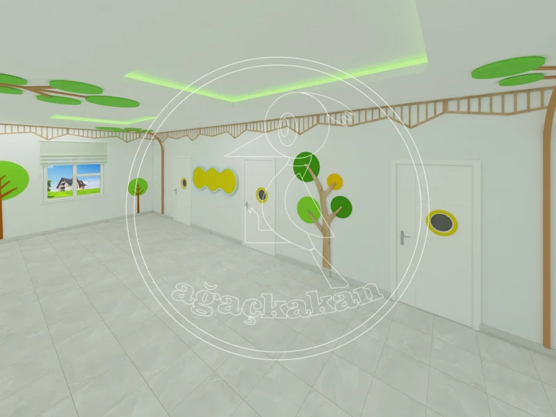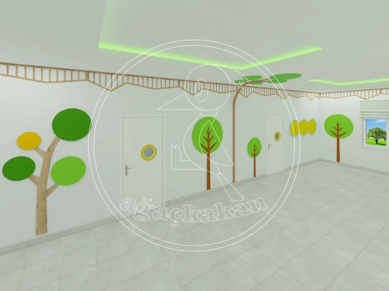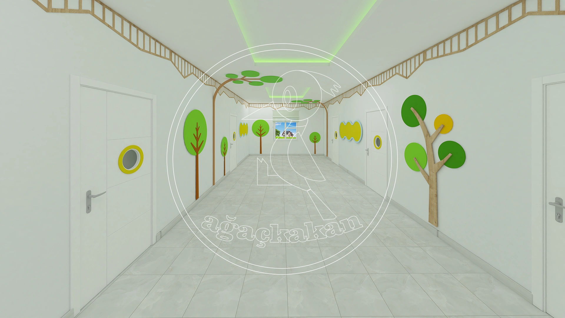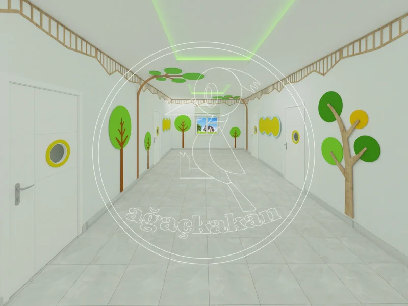 Anaokulları ve kreşlerde çocukların gelişimini destekleyen eğitim ortamları büyük önem taşır. Doğa ve ağaç dekorları ile tasarlanan bir okul koridoru, çocuklara doğayla iç içe bir atmosfer sunarken, onların yaratıcılığını ve keşfetme duygusunu teşvik eder.