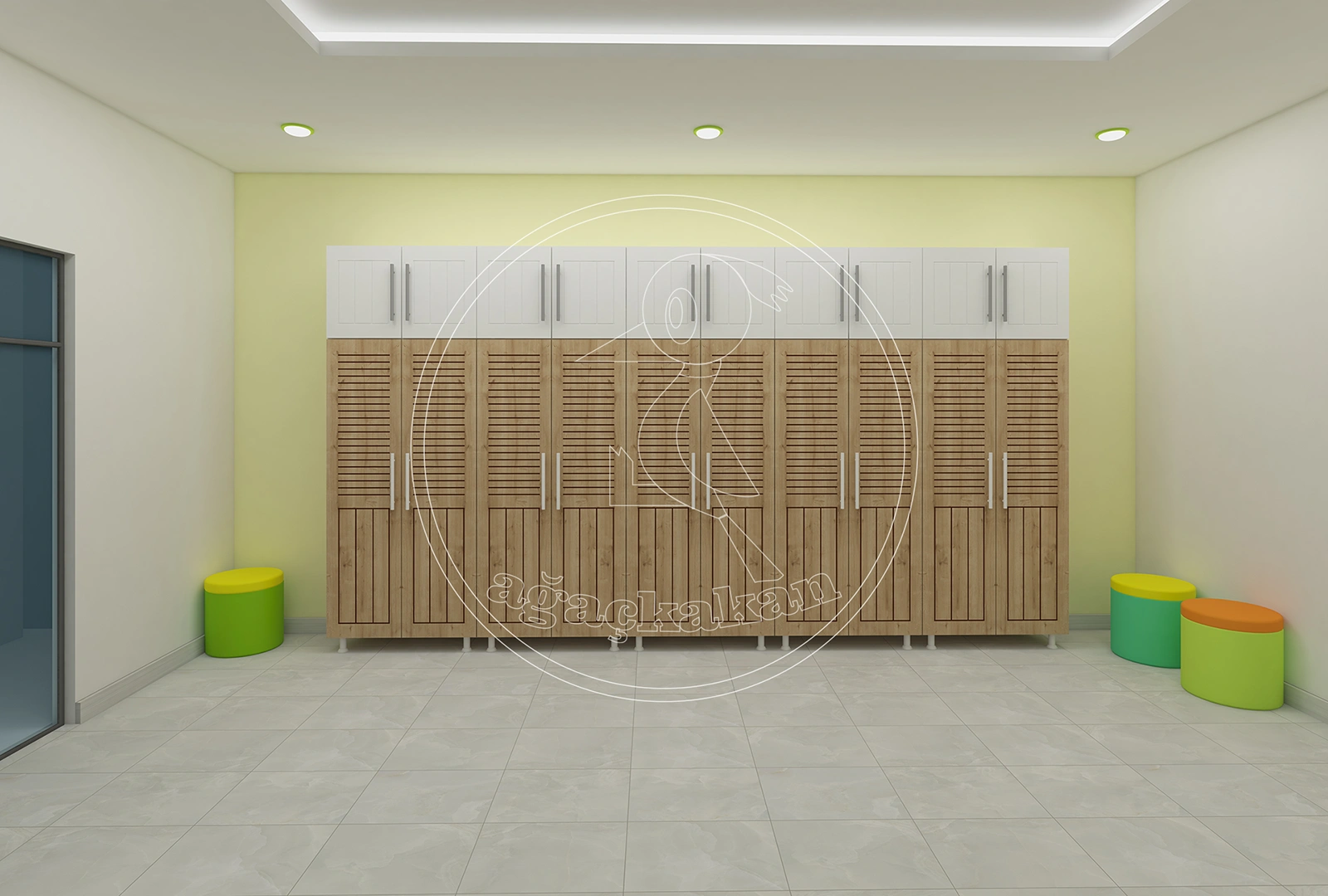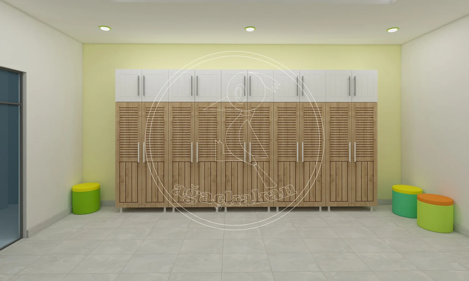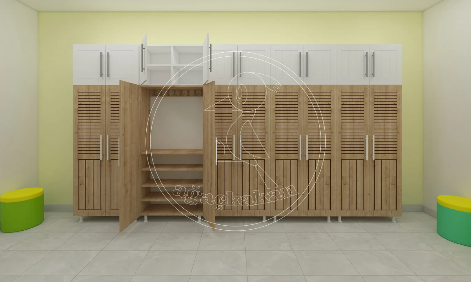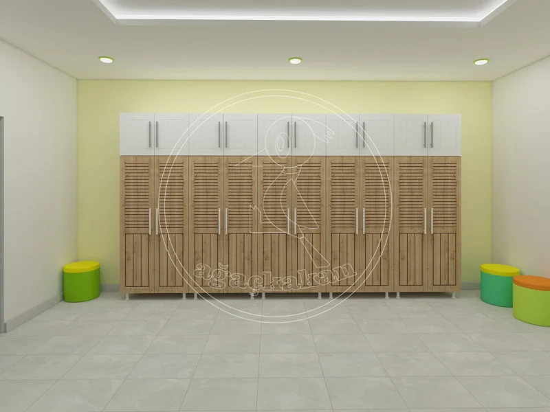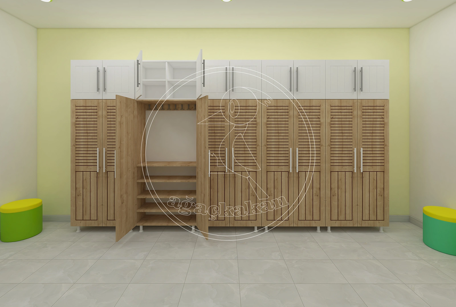 Doğal dokular ve renklerle tasarlanan portmanto ve ayakkabılıklar, anaokulu ortamına estetik bir değer katar. Canlı renkler ve konsept tasarımlar, çocukların dikkatini çeker ve sınıf atmosferine enerji katar. Bu da öğrenme ortamını daha davetkâr hale getirir.