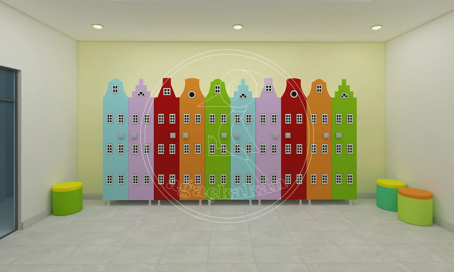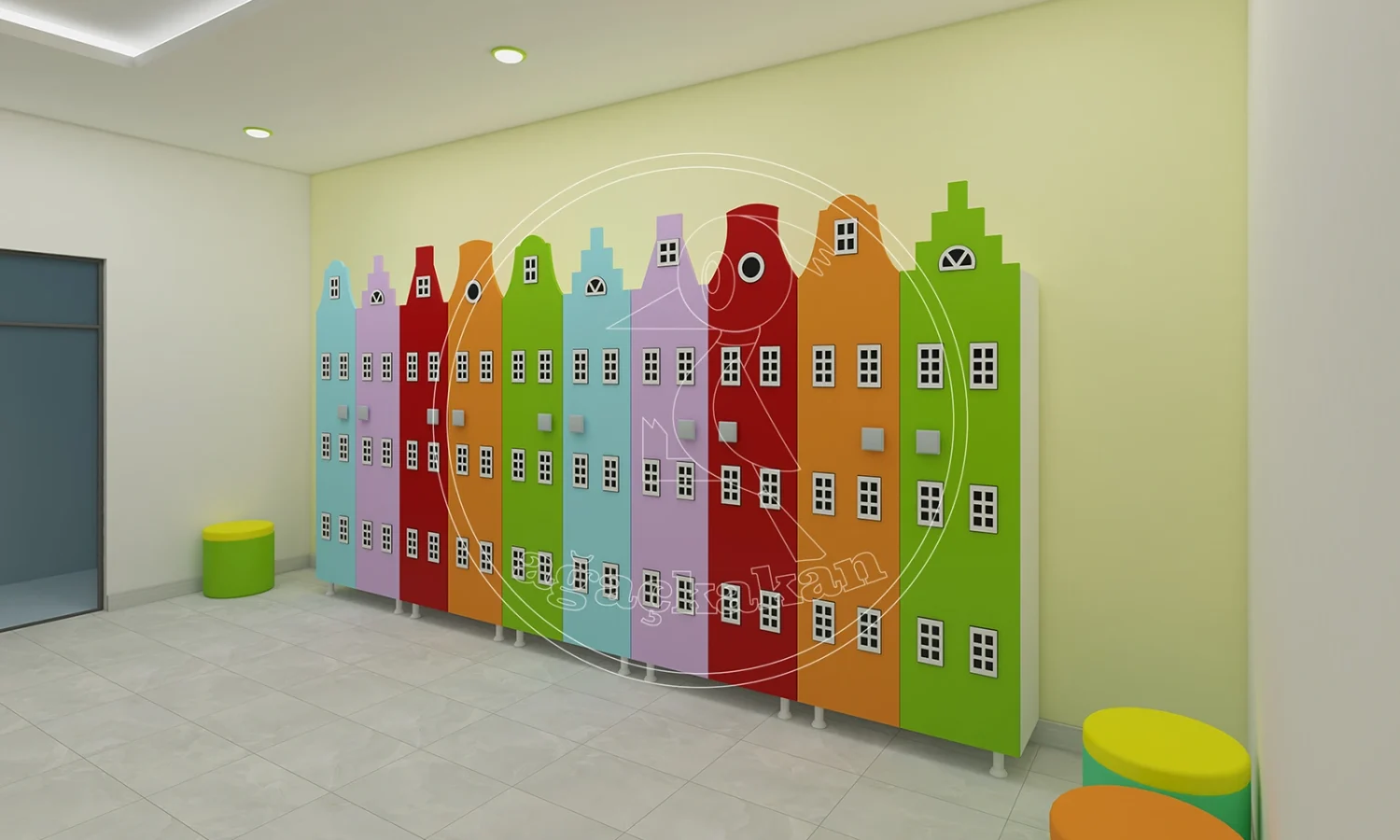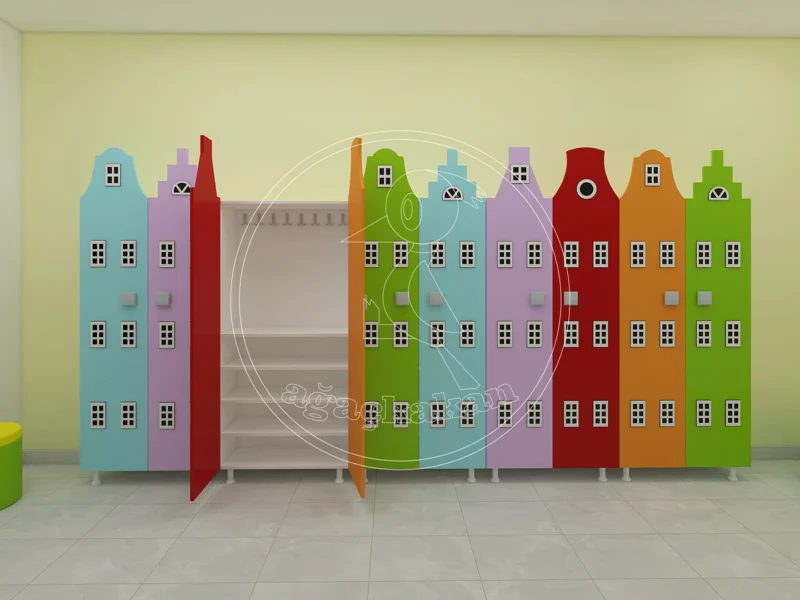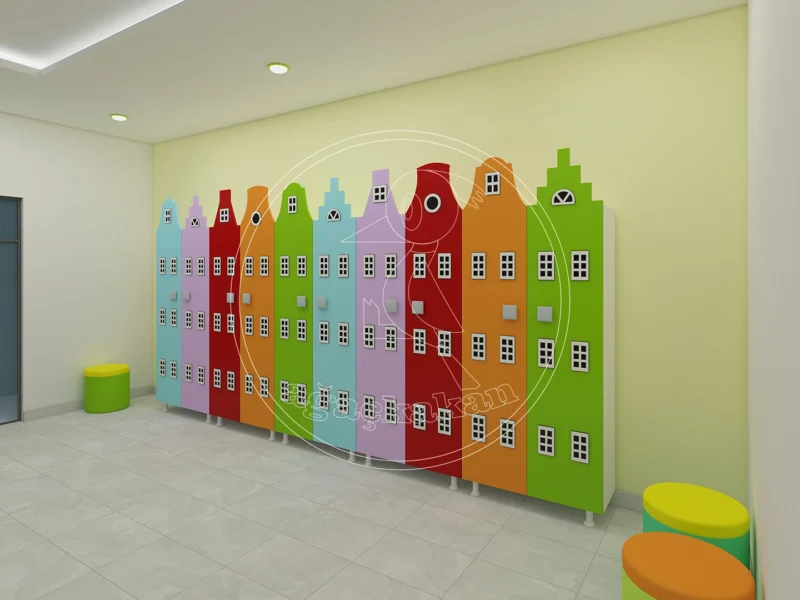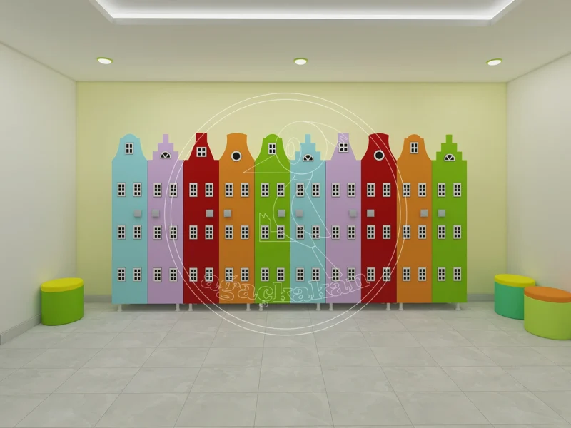 Anaokulu ortamlarında düzeni sağlamak, eğitim sürecinin verimliliğini artırır. Şehir dekorlu portmanto ve ayakkabılıklar, çocuklar için hem eğlenceli hem de işlevsel bir alan yaratır. Turuncu, sarı, pembe ve mavi tonlarındaki binalar, çocukların hayal gücünü desteklerken, bağımsız hareket etmelerine de yardımcı olur.