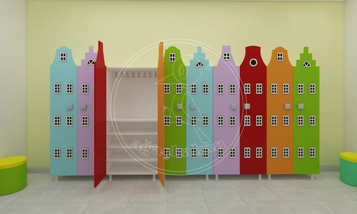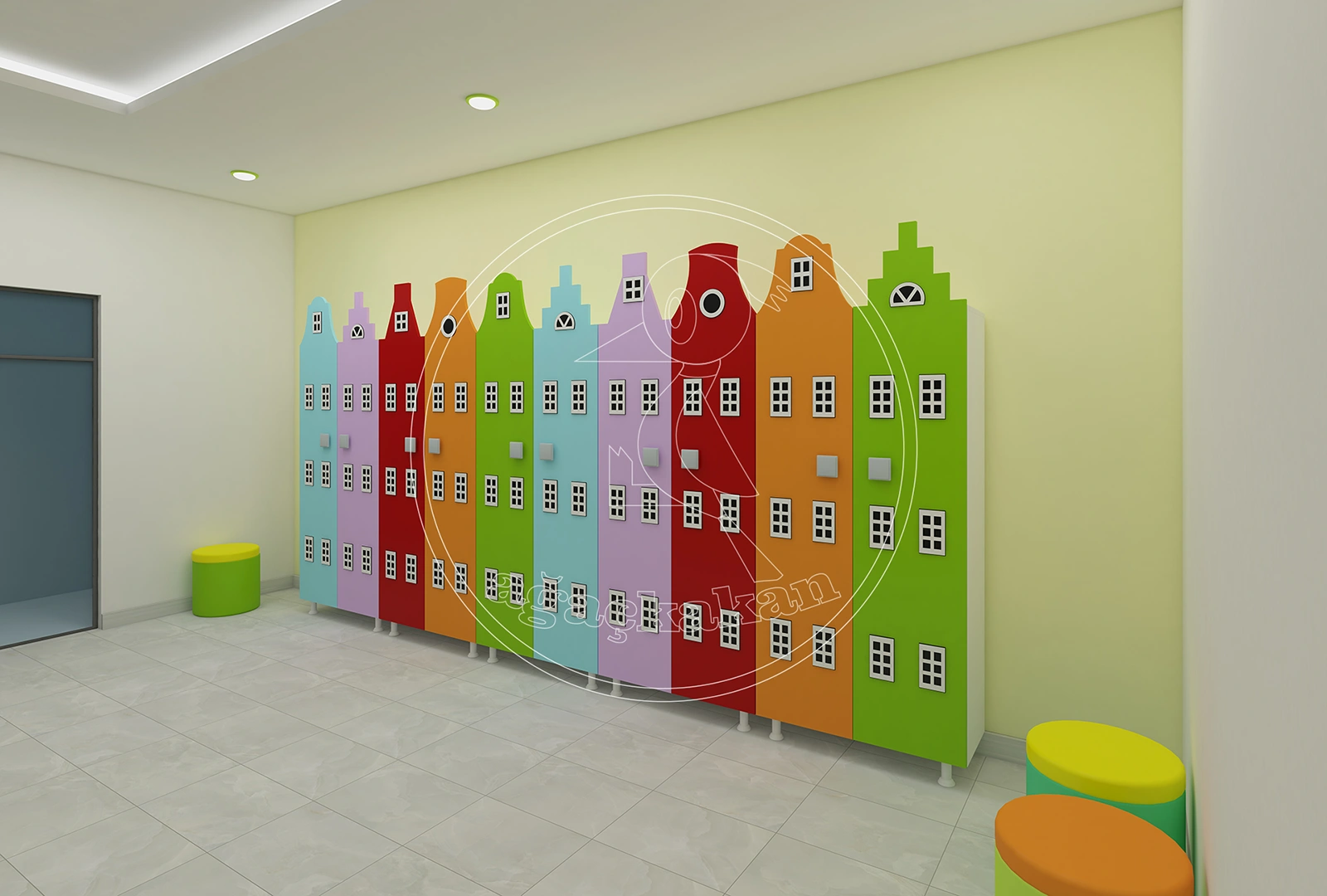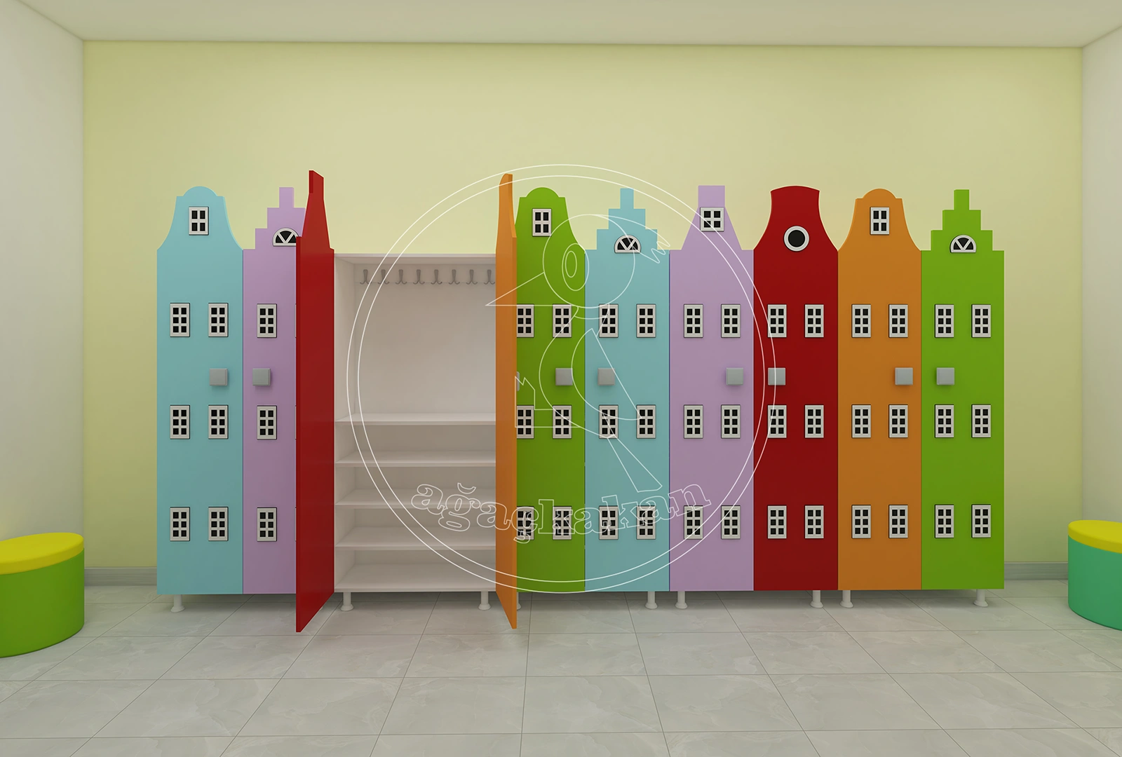Anaokulu ortamlarında düzeni sağlamak, eğitim sürecinin verimliliğini artırır. Şehir dekorlu portmanto ve ayakkabılıklar, çocuklar için hem eğlenceli hem de işlevsel bir alan yaratır. Turuncu, sarı, pembe ve mavi tonlarındaki binalar, çocukların hayal gücünü desteklerken, bağımsız hareket etmelerine de yardımcı olur.